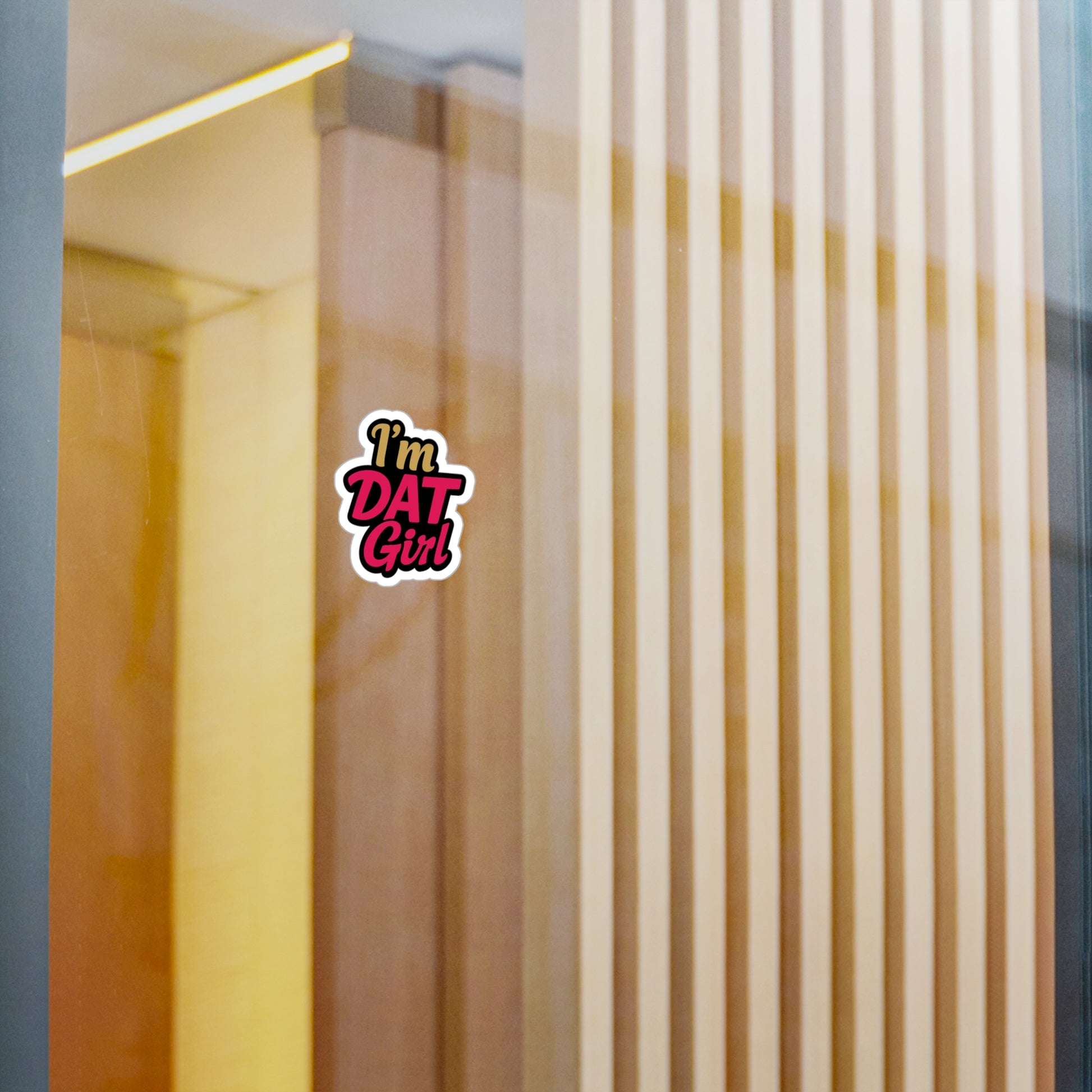 Bright, bold, and full of attitude — this kiss-cut vinyl decal says it loud: I’m DAT Girl. The glossy-satin sticker blends deep pink script with a shadowed black outline and a warm gold accent for a layered, pop-art look that stands out on laptops, water bottles, notebooks, and storefront glass. Because it’s printed on durable white vinyl with a 1/8" kiss-cut border, the shape reads crisply while remaining easy to remove without sticky residue. Weatherproof and UV resistant, the decal keeps its color and edge for years outdoors, so your statement travels with you from morning coffee runs to late-night drives.