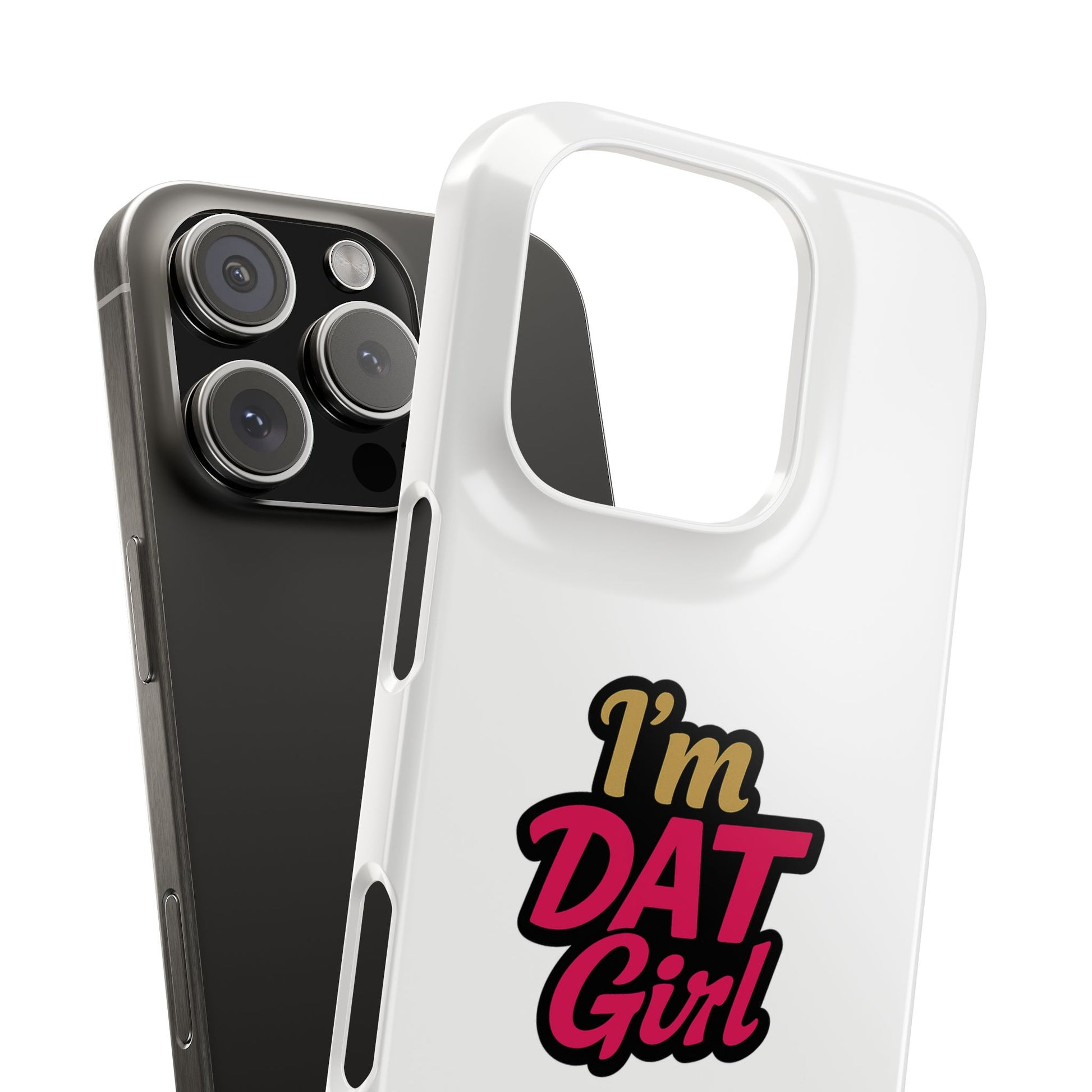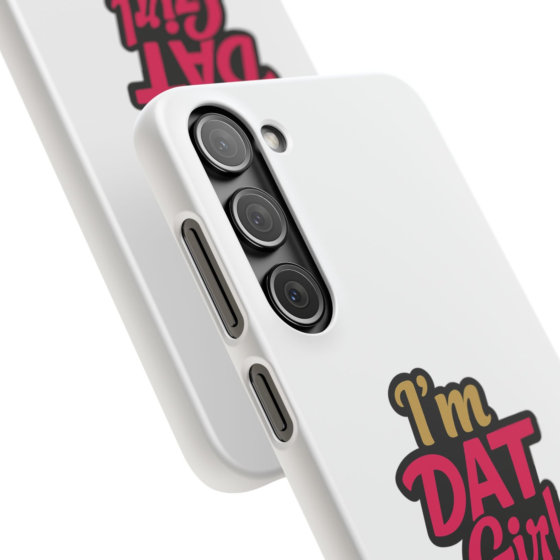 Slip this slim Snap Case onto your phone and let it carry a little attitude. The white polycarbonate shell keeps your device light and streamlined while a bold, retro-styled “I’m DAT Girl” graphic sits low on the back — playful, confident, and unmistakable. The finish options (glossy or matte) let you pick the look you want, and the case supports wireless charging with clear, open ports so everyday use stays effortless. Built to resist impact and outdoor wear, it ages gracefully when treated with simple care: avoid high alcohol liquids, prolonged direct sun, and heavy creams. This case feels like a confident sidekick for someone who likes bright colors, streetwise flair, and low-fuss protection.